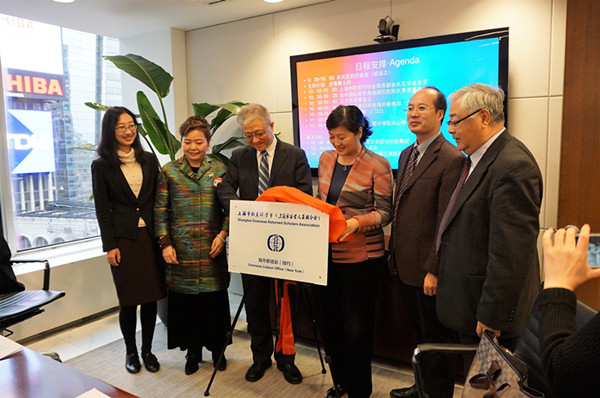 我会常务副会长左学金与美中国际商务高级研究院理事长王雪洁女士共同为海外联络站揭牌。中国驻纽约总领事馆教育领事王文华、王晓玉莅临揭牌仪式现场。王文华教育领事介绍了目前在纽约中国留学人员的现状。2016-2017年在纽约的中国留学人员11.9万人,占国际留学人员的32%。纽约领馆教育处非常关心中国留学人员,为留学人员提供形式多样的服务。他希望欧美同学会能为在纽约的留学人员为国服务、创新创业搭建更多的平台。我会常务副会长左学金和美中国际商务高级研究院院长夏善晨分别致辞。纽约当地高校学联、华人行业专业协会、华侨华人社团、当地政府、媒体等组织的代表近五十位嘉宾出席见证了我会海外联络站(纽约)的揭牌仪式。海外联络站的设立是为适应新时期形势发展的需要,将有利于加强上海与纽约地区海外留学人员的联系,对发掘优质海外人才资源,鼓励引导高层次留学人才为国服务和发挥作用具有重要意义。
